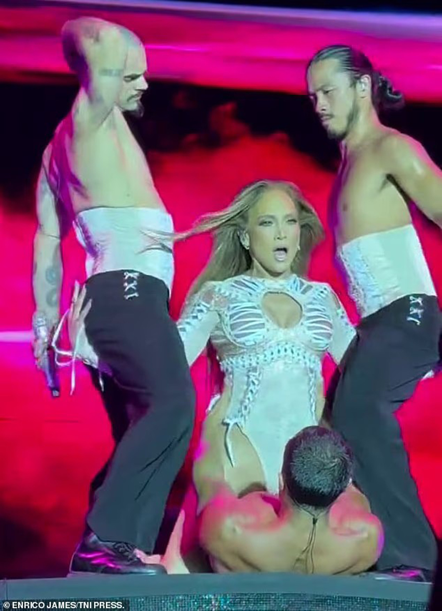 Σε ένα από τα πιο καυτά στιγμιότυπα της βραδιάς, η J.Lo σέρνεται στα τέσσερα μπροστά από έναν ημίγυμνο χορευτή και έχει το μικρόφωνο στο στόμα. Ενώ στη συνέχεια κάθεται πάνω στους ώμους ενός άλλου, με το… πράμα της στο στόμα του.